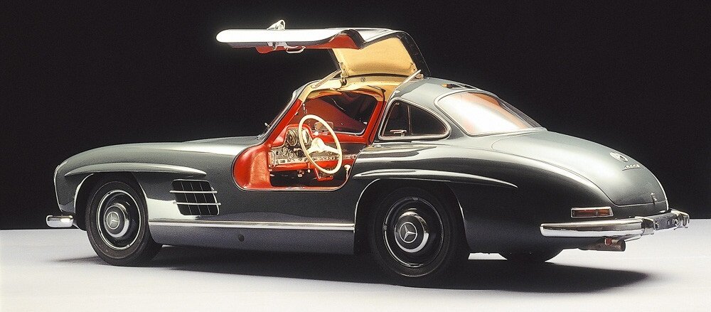 В послевоенную эпоху первым спортивным «Мерседес-Бенц» стал «Мерседес-Бенц» W 198. А вот почему его называли «Крыло чайки», разберёмся в нашей статье. По-другому модель, с без сомнения культовым автомобильным силуэтом, называлась 300 SL , однако в народе больше прижилось название «Gullwing» или «Крыло чайки». Почему? Почему «Крыло чайки»? Двери автомобилей тех времён, да и большинства современных, присоединены шарнирами, которые позволяют им распахиваться горизонтально. Однако у Gullwing это не так. Это первый в мире автомобиль с дверьми, которые открывались вверх. А в открытом положении двери 300 SL похожи на образ чайки с расправленными крыльями. В последствии у W 198 появилась и версия кабриолет, но уже, разумеется, без такой привлекающей внимание «фишки». Почему же была выбрана именно такая конструкция? Углубимся в историю побольше. Изначально 300 SL создавался для спортивных соревнований. Правда, при первоначальном конструировании автомобиля обнаружилось, что пространственная ра