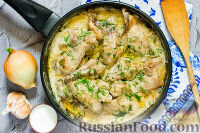 Продукты (на 6 порций) Курица - 1 шт. Масло подсолнечное - 2 ст.л. Сметана - 4 ст.л. Чеснок - 1-2 зубчика Лук репчатый - 1-2 шт. Вода или куриный бульон - 200 мл Мука
