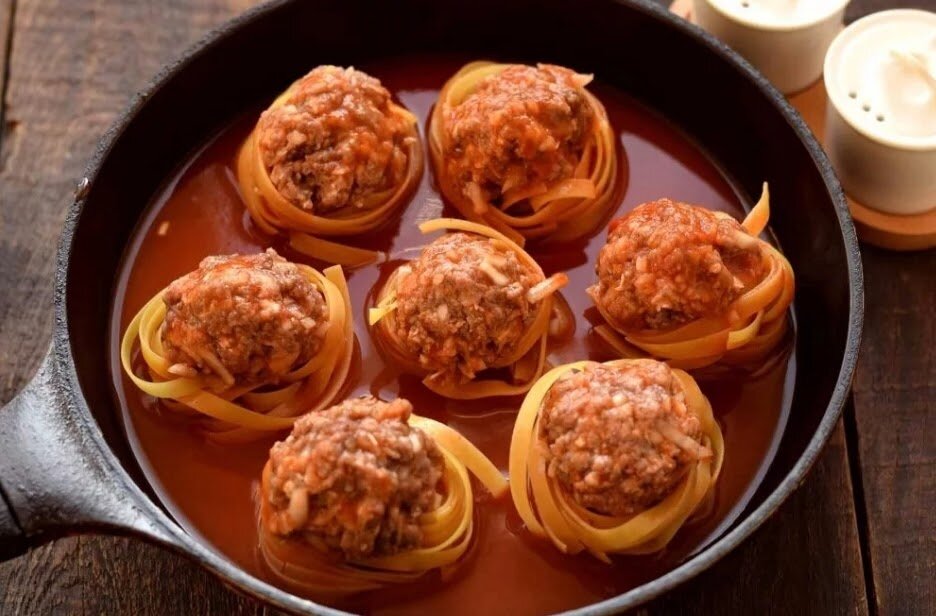 Гнезда из спагетти с фаршем