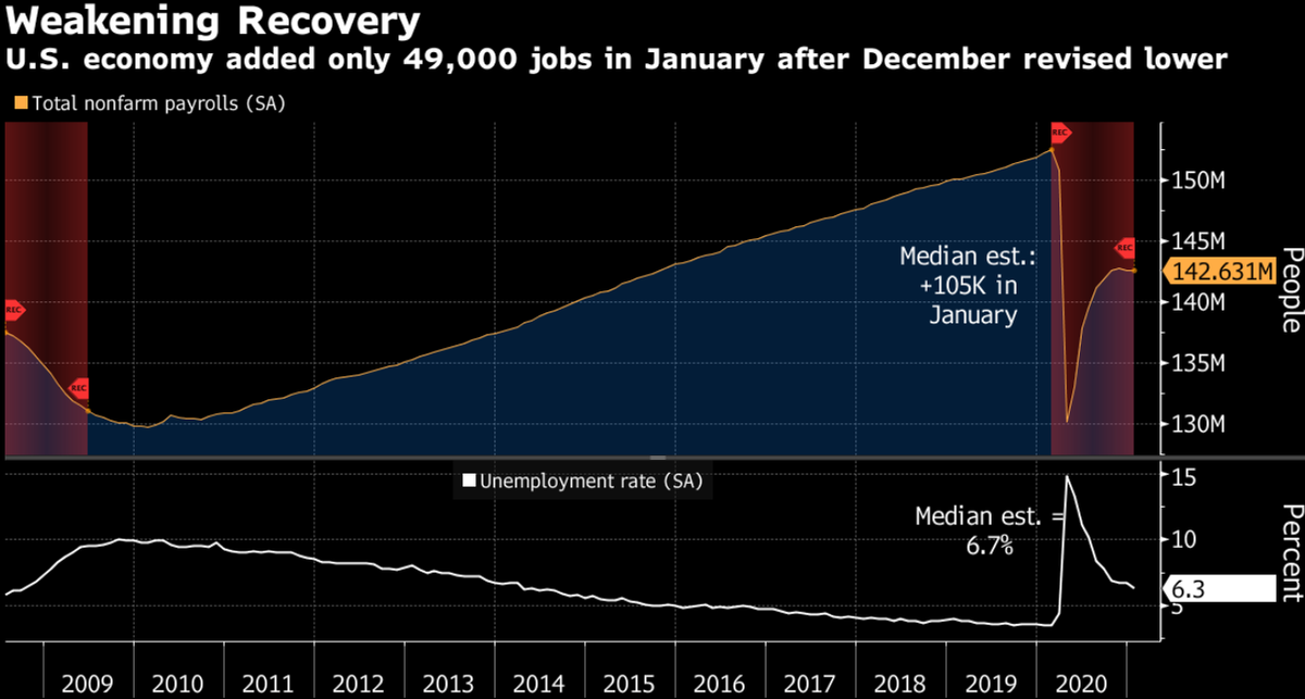 Занятость вне сельского хозяйства мало изменилась +49к (при прогнозе +50к) – но крупнейшие инвест дома как я ранее говорил ТУТ имели разброс прогнозов от -200к до +400к и большинство прогнозировало больше в сторону повышения, но всё же занятость очень близка к консенсус прогнозу, но всё же хуже ожиданий. Экономика США, исходя из данных о количестве мест, росла очень сдержано из-за ограничений, связанных с пандемией.