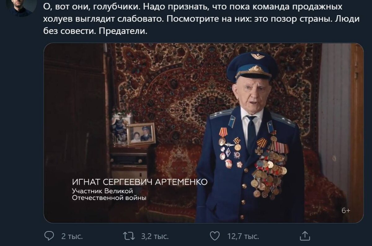 Я Артеменко Игнат Сергеевич, воинский подполковник в отставке, имею ранение, участвовал в партизанском движении, потом служил в армии. Узнал, что Навальный назвал меня предателем Родины, это меня очень огорчило, я вынужден защищать свою честь", — слово ветерана.