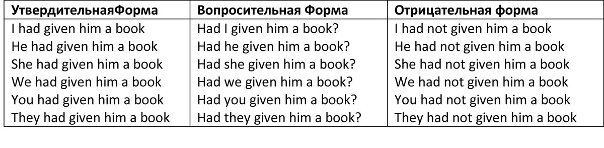 Past Perfect образуется из вспомогательного глагола to have в Past Indefinite ( had ) + Past Participle (причастие прошедшего времени) спрягаемого глагола.