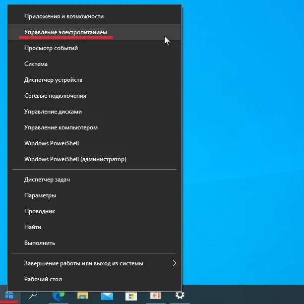 1. Нажимаем правой кнопкой мыши(ПКМ) на значок "Windows" в появившемся меню выбираем "управление электропитанием".