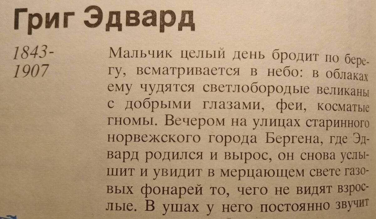 Это умение видеть и слышать по-особенному, отыскивать чудеса в самых обыкновенных вещах он сохранит надолго, на всю жизнь. Спустя много лет эти чудеса оживут в его музыке, которая сделается голосом его родной Норвегии и её народа. Имя Эдварда Грига облетит многие страны. О Григе узнают в Европе и Америке, он найдёт друзей в России.