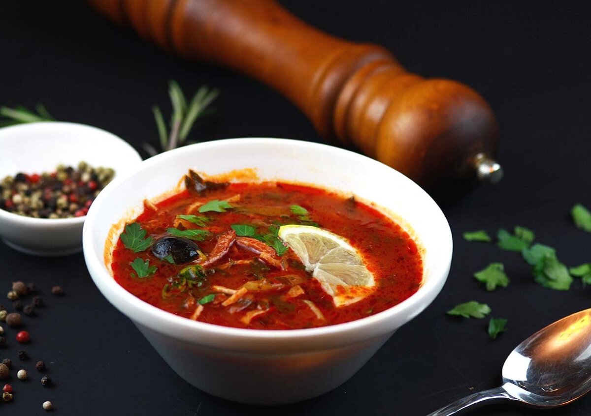 Солянка - это суп на крутом мясном, рыбном или грибном бульоне с острыми приправами. Основа солянки кисло-солёно-острая из за добавления таких компонентов, как солёные огурцы, лимон, маслины, солёные или маринованные грибы. Все эти ингредиенты придают супу своеобразный кисло-солёно-острый вкус. Во всех солянках много пряностей:перца, петрушки и укропа.