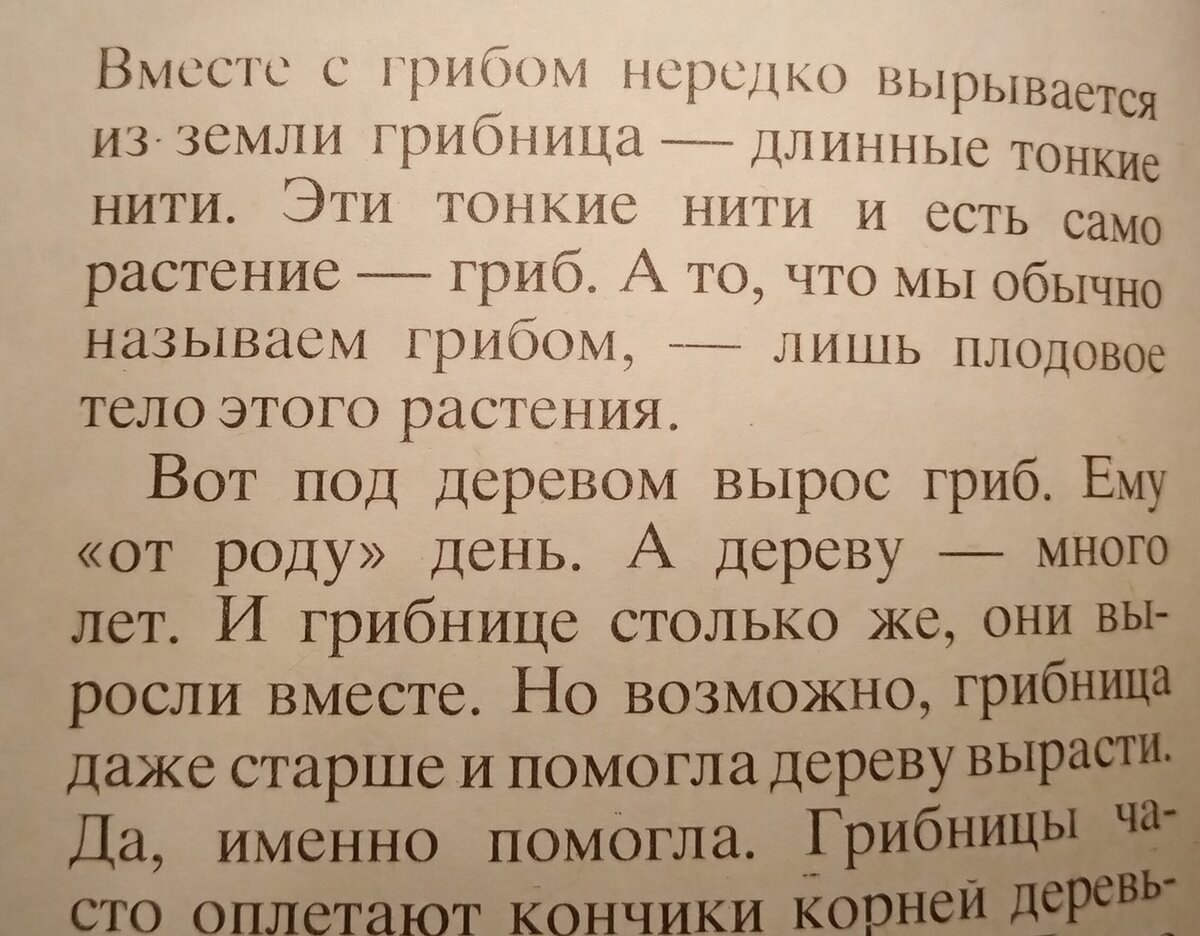Вот под деревом вырос гриб. Ему «от роду» день. А дереву — много лет. И грибнице столько же, они выросли вместе. Но возможно, грибница даже старше и помогла дереву вырасти, Да, именно помогла. Грибницы часто оплетают кончики корней деревьев. Это обоим очень удобно. Дерево даёт грибу готовую пищу — сахар, выделяемый корнями. А гриб снабжает его продуктами разложения веществ, которые содержатся в почве.