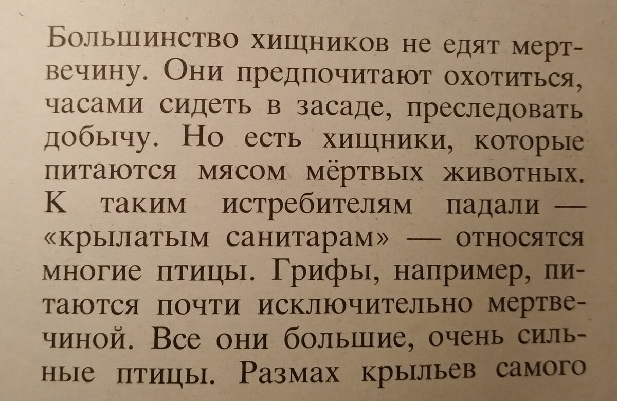 «крылатым санитарам» — относятся многие птицы. Грифы, например, питаются почти исключительно мертвечиной. Все они большие, очень сильные птицы. Размах крыльев самого маленького грифа — стервятника — 170 см, а кондора — до трёх метров. Это самая крупная хищная птица.