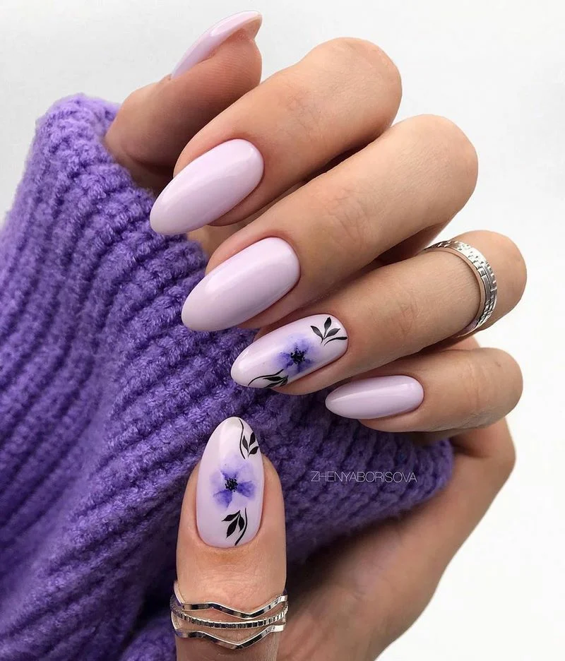 Весной 2021-2022 года просто невозможно обойтись без цветов в дизайне ногтей. Это самый популярный и трендовый вариант дизайна. Можно выбирать как цветочную роспись, так и наносить на один ноготок маленькие бутончики. Весной стоит обратить внимание на зеленый, желтый, сиреневый и розовый цвета лака.