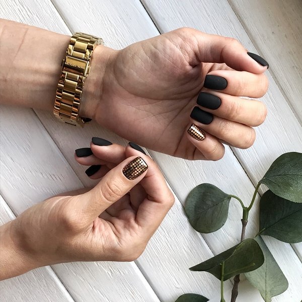 Используя матовый и глянцевый финиш в модном темном маникюре можно реализовать очень эффектные нейл-арт дизайны, как для праздника, так и на каждый день.
