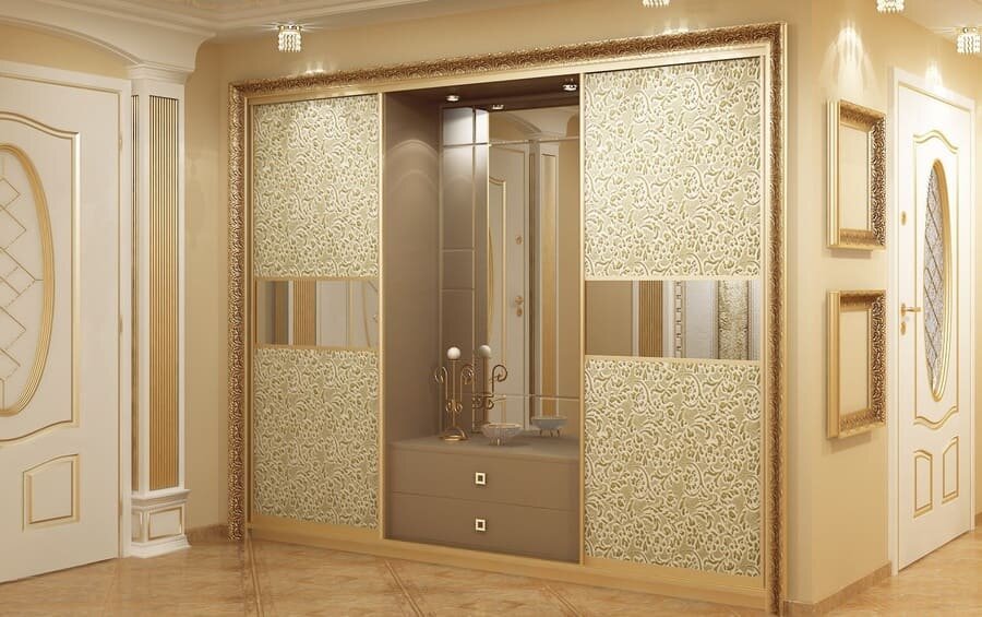 Покрыть зеркалом можно все створки или лишь одну. Отражающие поверхности визуально расширяют объём прихожей, что часто используется в маленьких квартирах.