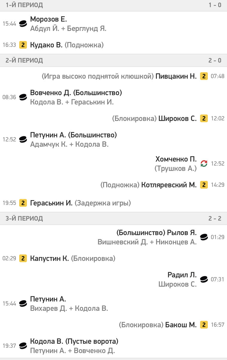 Встреча, прошедшая в Череповце в местном ледовом дворце, завершилась со счетом 5:2 в пользу хозяев. В их составе дублем отметился Александр Петунин (33-я и 56-я минуты), а по шайбе забросили Егор Морозов (16-я), Даниил Вовченко (29-я) и Владислав Кодола