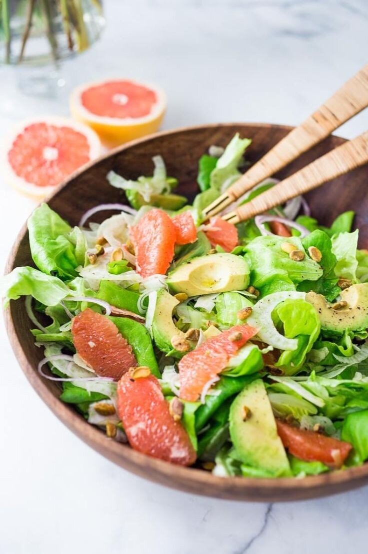 Нам понадобится: авокадо, руккола, мед, мангольд, свежие листья шпината, сегменты грейпфрута, лосось, оливковое масло, лимонный сок