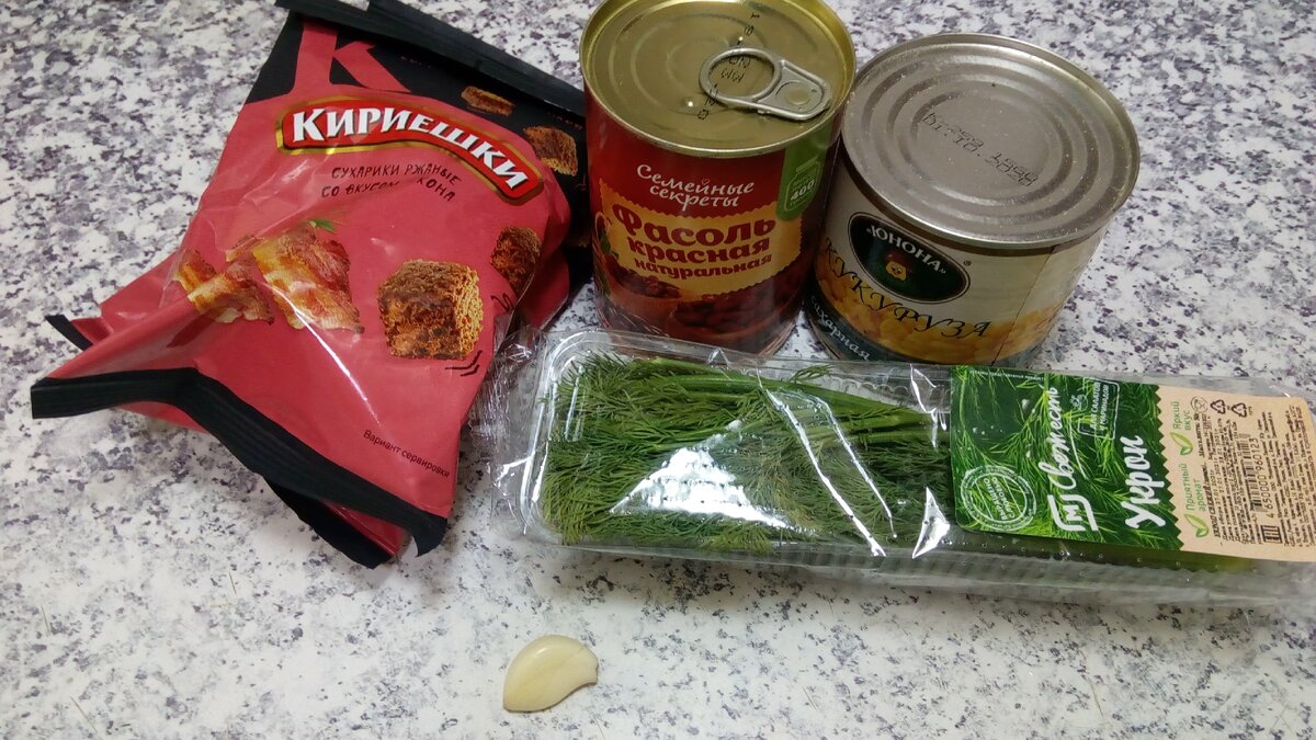Банка красной фасоли в собственном соку (без томата), банка кукурузы, укроп, зубчик чеснока и две