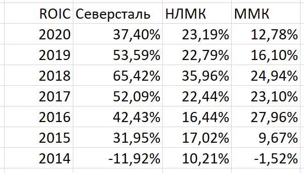 Северсталь показывает наилучшие показатели по рентабельности и она абсолютно точно превышает требуемую доходность. НЛМК в 2014-2016 годах, скорее всего не превышал требуемую доходность на капитал. ММК в 2020 показывает также низкую доходность, взлет котировок компании для меня является неоправданным.