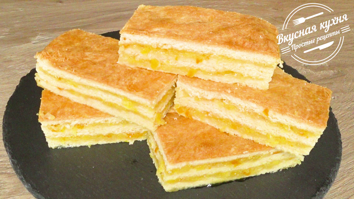 Выкладываю в форму первый пласт теста, на него - половину начинки, затем второй пласт и оставшуюся начинку , сверху - третий пласт.