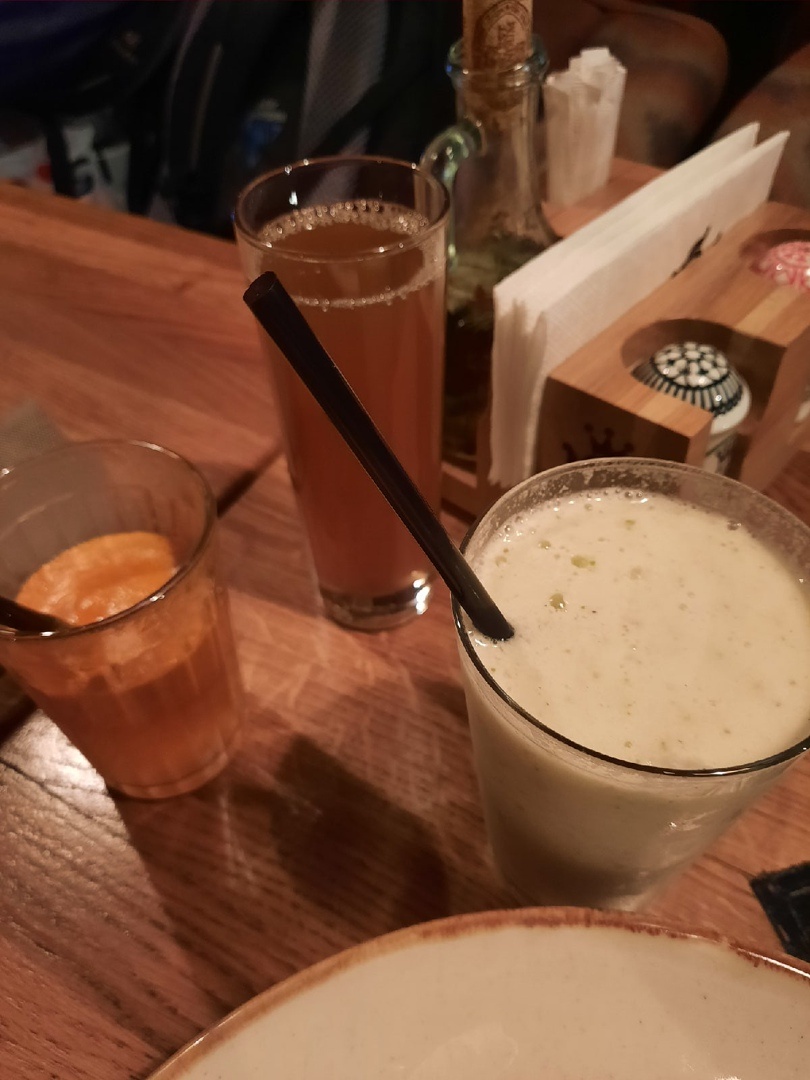Яблочно-морковный фреш был стабильно хорош, а вот имбирный щербет вызвал вопросы. Он смутно напоминал компот в школьной столовой, в который немного потерли имбирь. Вкуса не было, но жгло сильно.