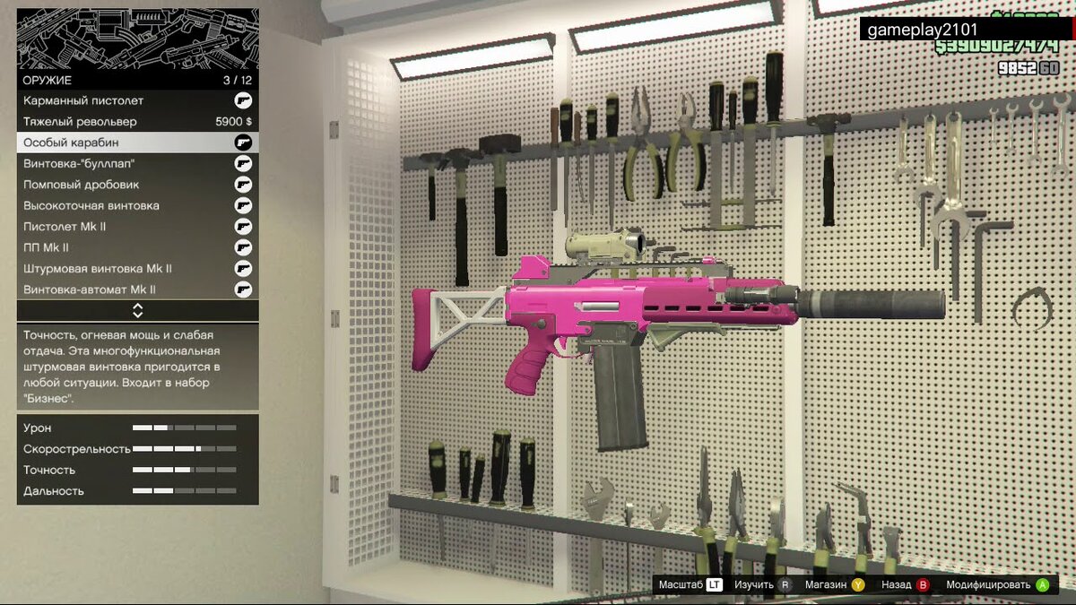 Описание: Высокоточная, даже на дальних дистанциях, штурмовая винтовка, которая была частью DLS «Бизнес». Благодаря доступности, хорошей всесторонней статистике и расширенному магазину с боеприпасами, это одно из самых популярных видов оружия в GTA Online. Единственное, что сдерживает Особый карабин – это его скорость стрельбы, которая ниже, чем у продвинутой винтовки, что делает его несколько хуже, чем на очень близких дистанциях, но это компенсируется высоким уроном за выстрел и превосходной точностью.