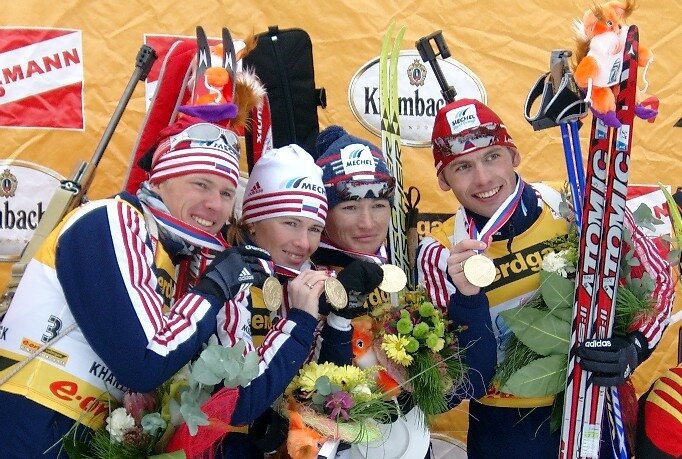 Впервые чемпионат мира по биатлону был проведен в далеком 1958г. в городке Зальфельден, Австрия. Тогда разыграли всего один комплект медалей в одной дисциплине - индивидуальной гонке на 20км у мужчин, победителем в которой блы шведский спортсмен по фамилии Виклунд, со звучным именем Адольф. Неофициально также была проведена мужская эстафетная гонка 4*7,5км, но в программу чемпионатов мира эта дисциплина вошла только в 1966 году. Сейчас мы уже привыкли, что главный старт сезона начинается со смешанной эстафеты, но это довольно молодой вид биатлонных состязаний, вошедших в программу Чемпионатов мира и Кубка мира. И тут нам есть чем гордится: в рамках Кубка мира первая смешанная эстафета прошла в сезоне 2002/2003 в немецком Рупольдинге, победу в которой одержала команда России в составе Анны Богалий, Сергея Русинова, Ольги Зайцевой и Сергея Башкирова. В рамках гонки биатлонисты пробежали 4*4,6км. На Чемпионатах мира эта дисциплина дебютировала в 2005г. в Ханты-Мансийске и здесь золотую медаль также завоевали спортсмены нашей страны: Ольга Пылева, Светлана Ишмуратова, Иван Черезов и Николай Круглов. Примечательно, что второе место осталось за нашей второй командой.