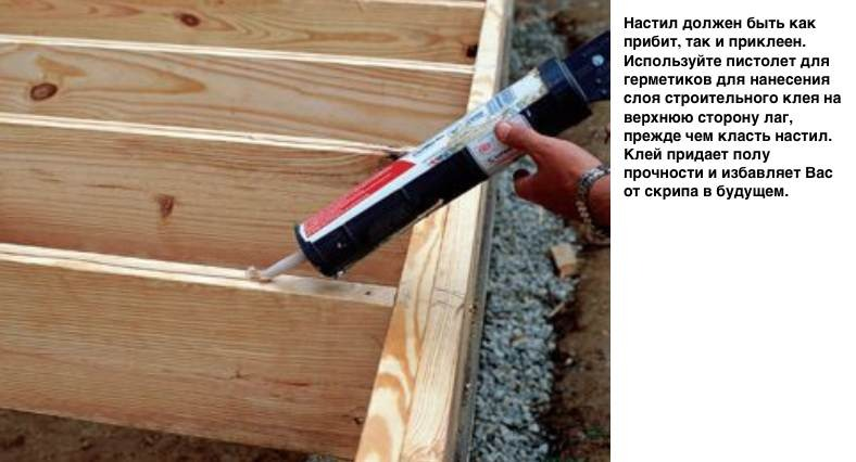 Перед тем как укладывать каждый лист настила, нанесите непрерывный слой строительного клея толщиной ¼ дюйма(0.63 см) на лаги под листом (см. фото ниже). Это сделает пол структурно прочнее и предотвратит возникновение скрипа в будущем.