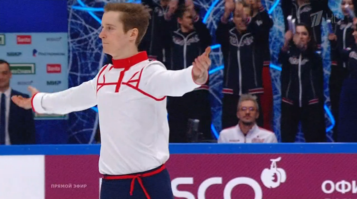Марк Кондратюк. Бронзовый призёр ЧР. Вообще в лицо его не знаю. Костюм у него, конечно... Но он в этом не виноват. Хороший мальчик, очень способный или трудолюбивый. Каким-то чудом приземлил 3А. Интересная программа в конце, очень) Исполнена дико зажигательно!) Всё-таки мальчиков у нас много хороших.