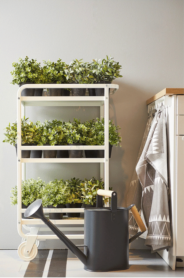 Если вы не хотите, чтобы растения заполонили весь дом, то вот решение: выберите один предмет мебели для устройства мини-сада. Это может быть подоконник, книжная полка, комод или даже тележка на колесиках. Благодаря колесикам ее можно перемещать из одной комнаты в другую, а в комплекте с несколькими отсеками она идеально подходит для небольших вьющихся цветов и суккулентов.