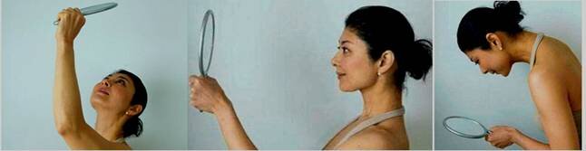 - Так вы выглядели 10 лет назад. Возьмем зеркало с длиной ручкой. Поднимем лицо вверх и посмотримся в зеркало, вытянув руку.