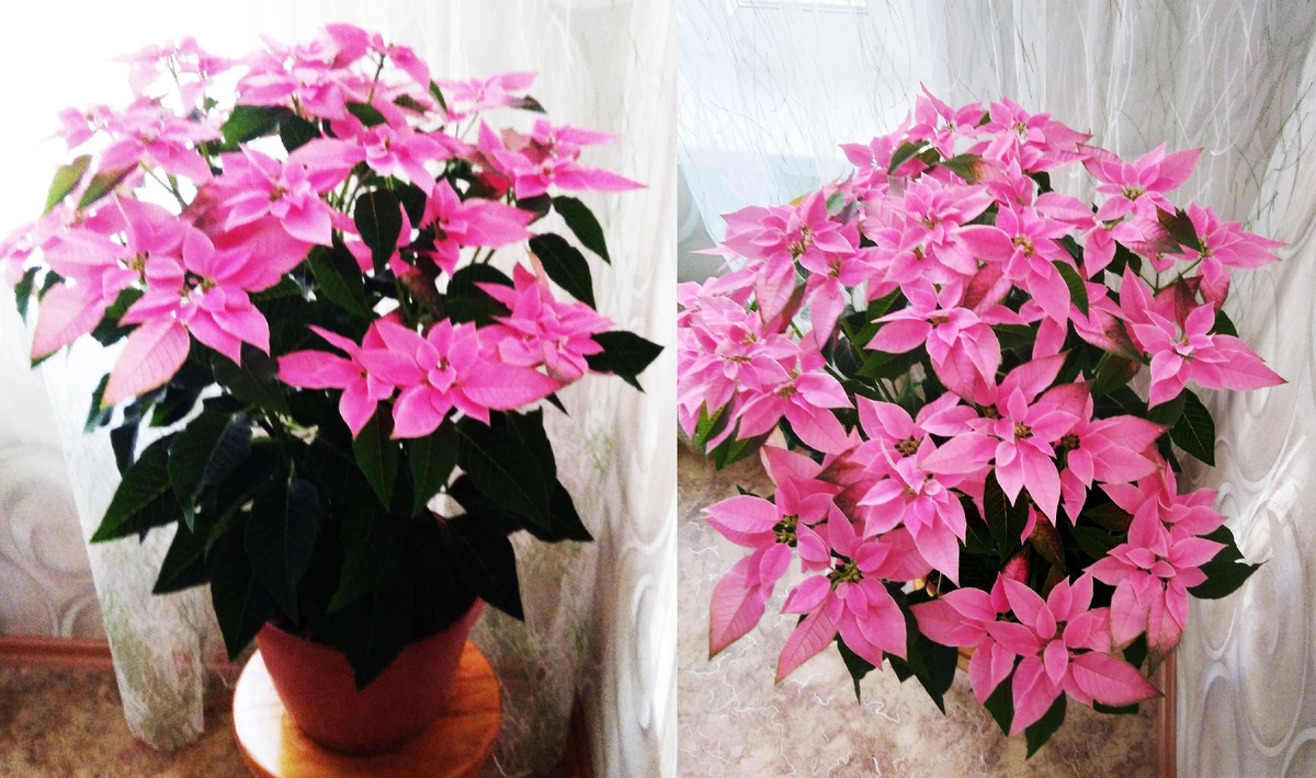 Вы думаете, эта шикарная розовая шапка состоит из цветов? Не угадали, это прицветники, а цветочки у него очень мелкие и неказистые, на которые и внимания-то сразу не обратишь. Цветет пуансеттия с декабря по февраль. Представляете - на улице снег, холодрыга, ветер или промозглая слякотища, а у вас дома всю зиму эта красотень стоит и глаз радует. Вот такое мы приобрели себе чудо, хотя и совсем непростое. Его сок может вызывать раздражение кожи, а также тошноту, рвоту или диарею . Так что – соблюдайте технику безопасности и будет вам счастье.