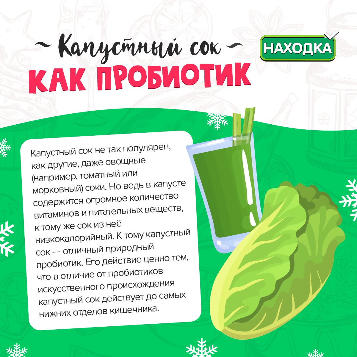 Капустный сок не так популярен, как другие, даже овощные (например, томатный или морковный) соки. Но ведь в капусте содержится огромное количество витаминов и питательных веществ, к тому же сок из неё низкокалорийный. К тому капустный сок — отличный природный пробиотик. Его действие ценно тем, что в отличие от пробиотиков искусственного происхождения капустный сок действует до самых нижних отделов кишечника.