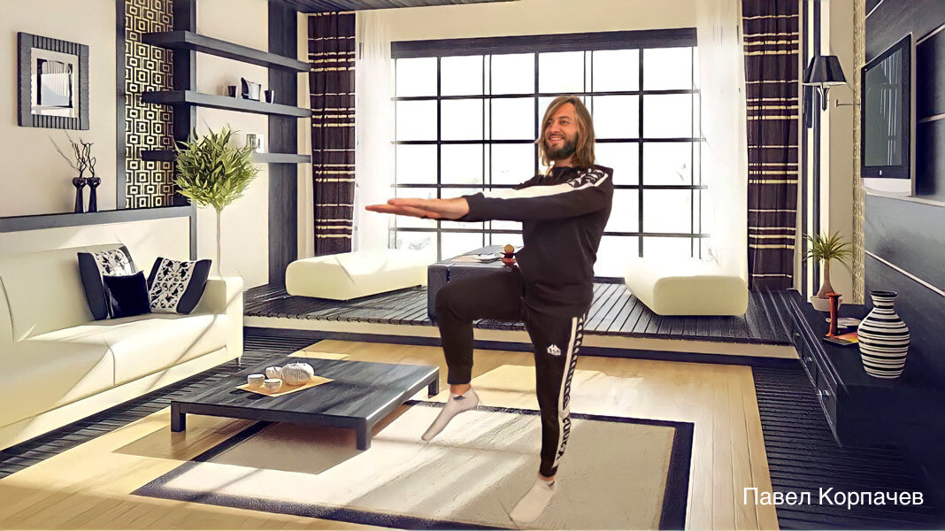 Это королевское упражнение на мышцы ног и ягодиц. Лучше ничего не придумаешь. Наша задача разобраться с вопросом суставов. Если болят колени, и у вас есть диагноз от врача, где требуется ограничить сгибание и разгибание в коленном суставе, то приседания не для вас. Если же ограничений нет, но есть дискомфорт, то упрощаем движение. Выполняем приседания на стул или полуприсед. В том случае, если организм дышит здоровьем и требует приседа, даем ему вариант до параллели с полом. Но все же берегите суставы, лишний вес опасен, идите от меньшего к большему. Сначала полуприсед, потом пониже. Таким образом, вы сможете провести самодиагностику. Если суставы (не путать с мышцами) не болят, садимся ниже. Но соблюдаем технику обязательно. Работаем непрерывно 30 секунд или 15-20 повторов, далее 30 секунд отдыхаем и переходим к следующему упражнению.