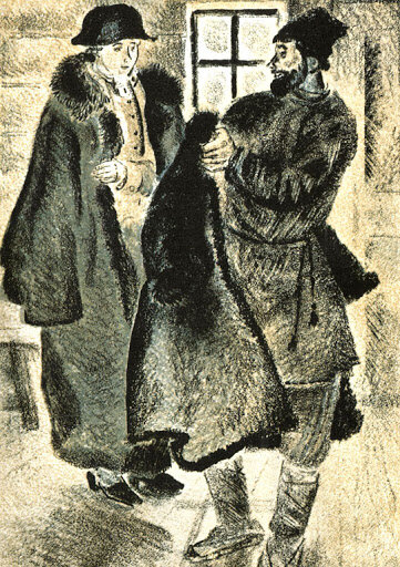 Однако заячий тулуп явился. Мужичок тут же стал его примеривать. В самом деле тулуп, из которого успел и я вырасти, был немножко для него узок. Однако он кое-как умудрился и надел его, распоров по швам. Савельич чуть не завыл, услышав, как нитки затрещали. Бродяга был чрезвычайно доволен моим подарком. Он проводил меня до кибитки и сказал с низким поклоном: «Спасибо, ваше благородие! Награди вас Господь за вашу добродетель. Век не забуду ваших милостей». Он пошёл в свою сторону, а я отправился далее, не обращая внимания на досаду Савельича, и скоро позабыл о вчерашней вьюге, о своём вожатом и о заячьем тулупе».