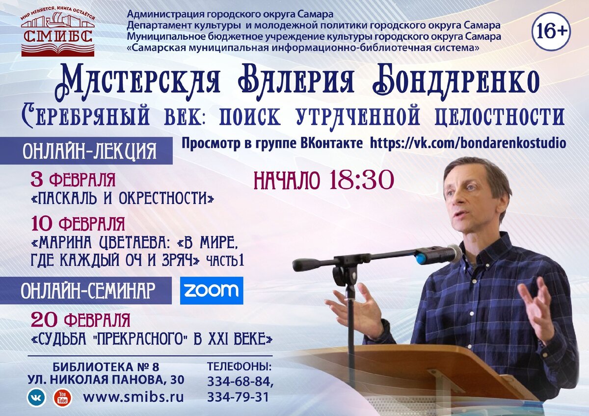 "Мастерская Валерия Бондаренко" - это цикл лекций, посвященных духовным исканиям творческих людей Серебряного века. Валерий Вениаминович Бондаренко - педагог, журналист, тренер, кинокритик, киновед, филолог, перформер, член союза Кинематографистов России. Куратор имиджевых и социальных проектов. Автор четырёх книг,