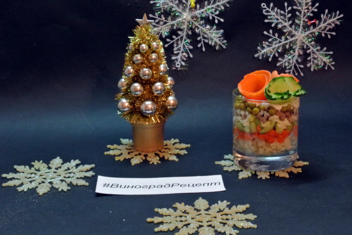 Очень люблю салат "Оливье". Подача бывает разной, в зависимости от настроения. Салат готовила на новогодний стол. Список продуктов: Как готовить: 1. Отварить мясо. Я отвариваю мясо в предыдущий день, оставляю в бульоне. Остудить,. 2. Нарезать мелкими кубиками. 3. Овощи отварить. 4. Остудить. Очистить.Нарезать кубиками одинакового размера. 5. Два отварных яйца мелко нарезать. Вместо колбасы добавляю отварную говядину, нарезанную мелкими кубиками. Для дочки готовлю салат с солеными огурцами, себе - со свежими огурцами. Заправляю салат сметаной с добавлением майонеза. Раскладываю салат в салатники слоями, чтобы была видна цветовая палитра салата и продукты, составляющие салат. Сверху салата размещаю сметану с майонезом, и за столом уже каждый перемешивает салат. Приятного аппетита! Еще больше рецептов есть у нас на сайте Vinograd.pw и в нашей группе Вконтакте