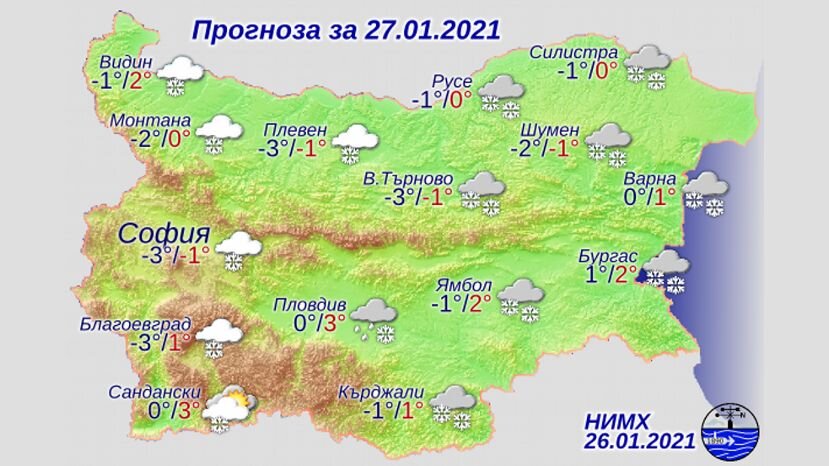 Ночью будет облачно со снегопадом. В восточных районах с понижением температуры дождь перейдет в снег и образуется снежный покров. С умеренным, в восточных районах сильным северным ветром в страну продолжит поступать холодный воздух. Минимальная температура будет между минус 5° и 0°. Днем останется облачно, к обеду снегопад прекратится, но в Северо-восточной Болгарии продолжит идти снег.