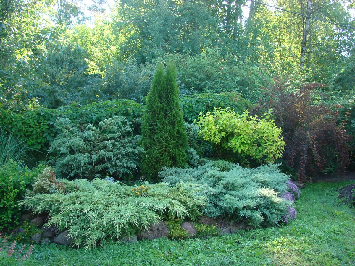 Новые можжевельники! Малюсенькие! По углам! Подальше друг от друга. А еще надо что-нибудь кругленькое! Туя-шарик, елочка-не елочка с розово-голубыми мягонькими иголочками (кипарисовик горохоплодный, тогда я этого не знала; ОБИ – хвойные в ассортименте). Все махонькое. По сторонам заняли свои посты кусты. Справа пузыреплодники, желтый и бордовый. Тоже не маленькие, уже видно от земли. Слева чубушник махровый (уже пересадила).