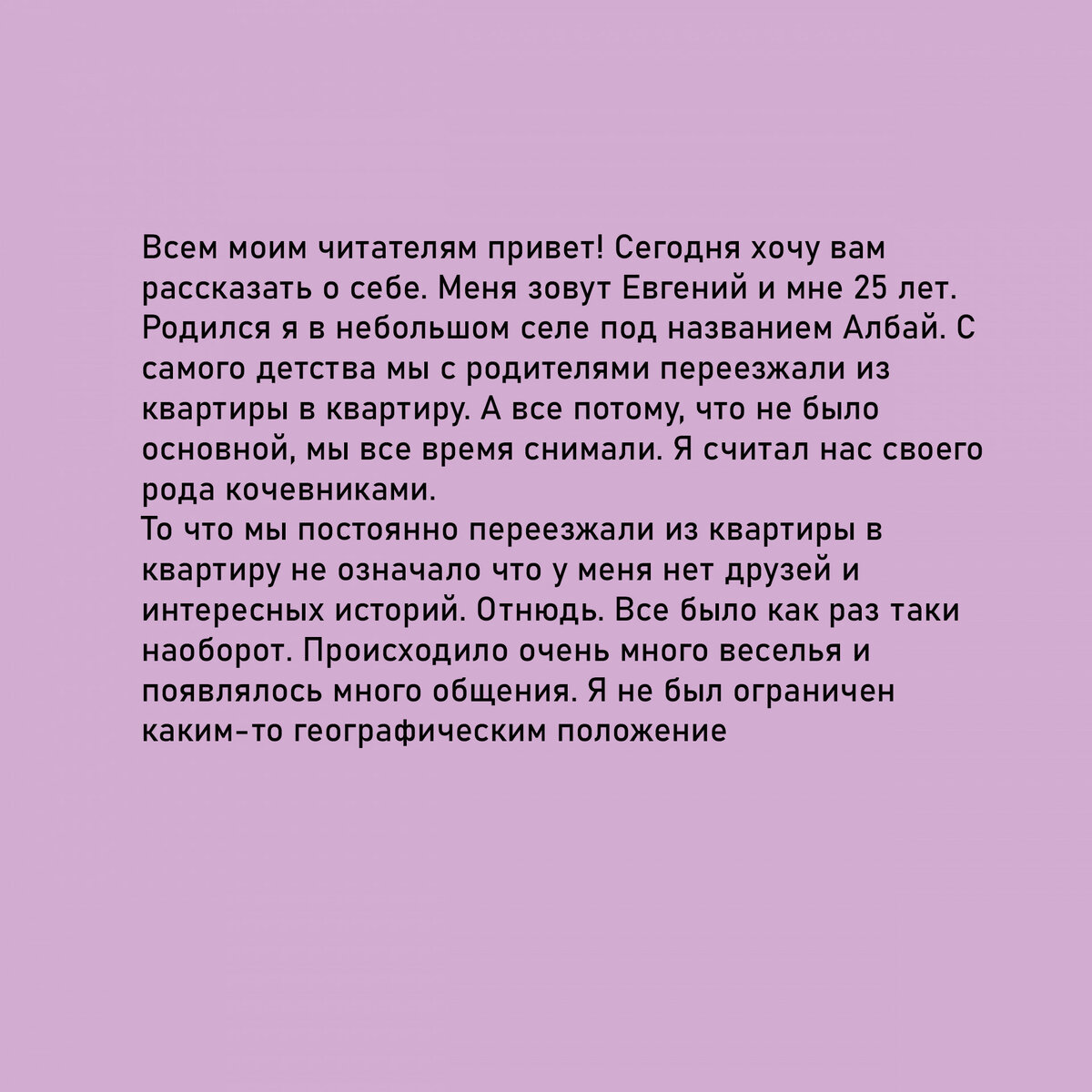 Всем моим читателям привет! Сегодня хочу вам рассказать о себе. Меня зовут Евгений и мне 25 лет. Родился я в небольшом селе под названием Албай. С самого детства мы с родителями переезжали из квартиры в квартиру. А все потому, что не было основной, мы все время снимали. Я считал нас своего рода кочевниками.