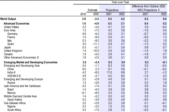 В октябрьском (от 2020) прогнозе МФВ, прогнозировалось, что мировая экономика в 2020 году снизится на -4.4%, а в январском (от 2021) прогнозе МВФ предполагает, что падение в 2020 было на -3.5%. Учитывая, что в январском (от 2021) прогнозе, прогнозируется рост ВВП в 2021году на 5.5%, то как мне кажется – это 5.5% в 2021 году справедливая цифра и больше вряд ли будет, так как вакцинация в мире идёт очень медленно, а экономическое неравенство растёт.