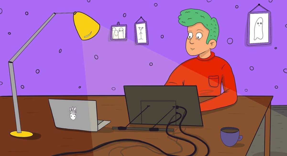 Подготовьте для себя большой стол и удобный стул. Многие иллюстраторы покупают сразу два стола — один для традиционных материалов (акварель, гуашь и т.д.), второй — для девайсов. Мне хватает одного большого стола для всей техники, кружки с кофе и книг.