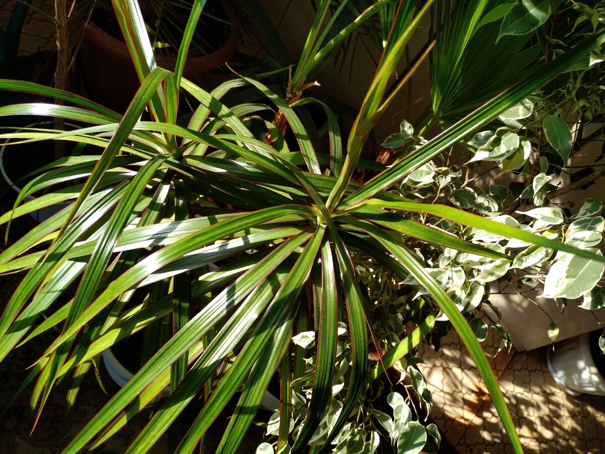 Второй зеленый угол: пальмы Ливинстоны, Вашингтония, кофе, вариегатный фикус. Драцена, которую мы обрезали в прошлом году, помните? В глубине прячется агава. Свою порцию солнца она получит летом. Укрывает их всех финиковая пальма, настоящий гигант. Она выращена из косточки лет восемь или десять назад.