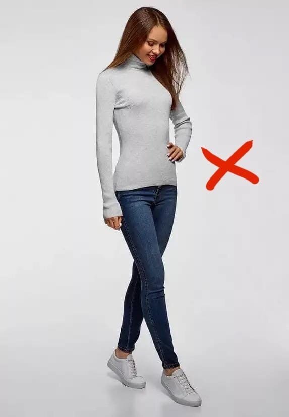 Особенно странно выглядит данная комбинация, если брюки или джинсы с защипами или декором, а сверху изо всех сил натянут обтягивающий джемпер, водолазка, футболка.