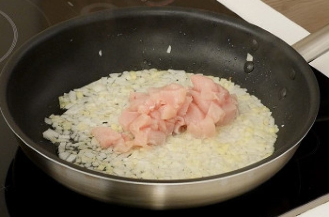 2. На растительном масле обжариваем измельченный лук до прозрачности, затем добавляем курицу (мелко нарезанную), солим и жарим еще 5 минут, до готовности курицы.