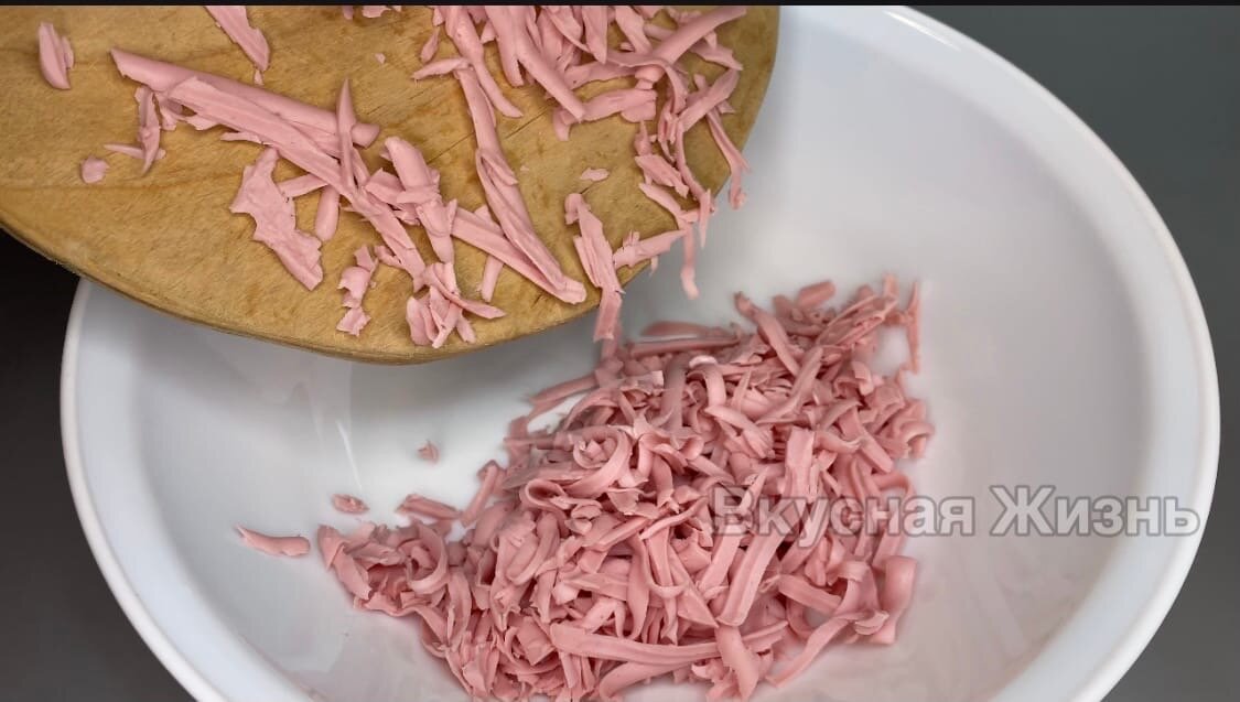 1. Колбасу или ветчину натираем на крупной тёрке и перекладываем в глубокую тарелку.