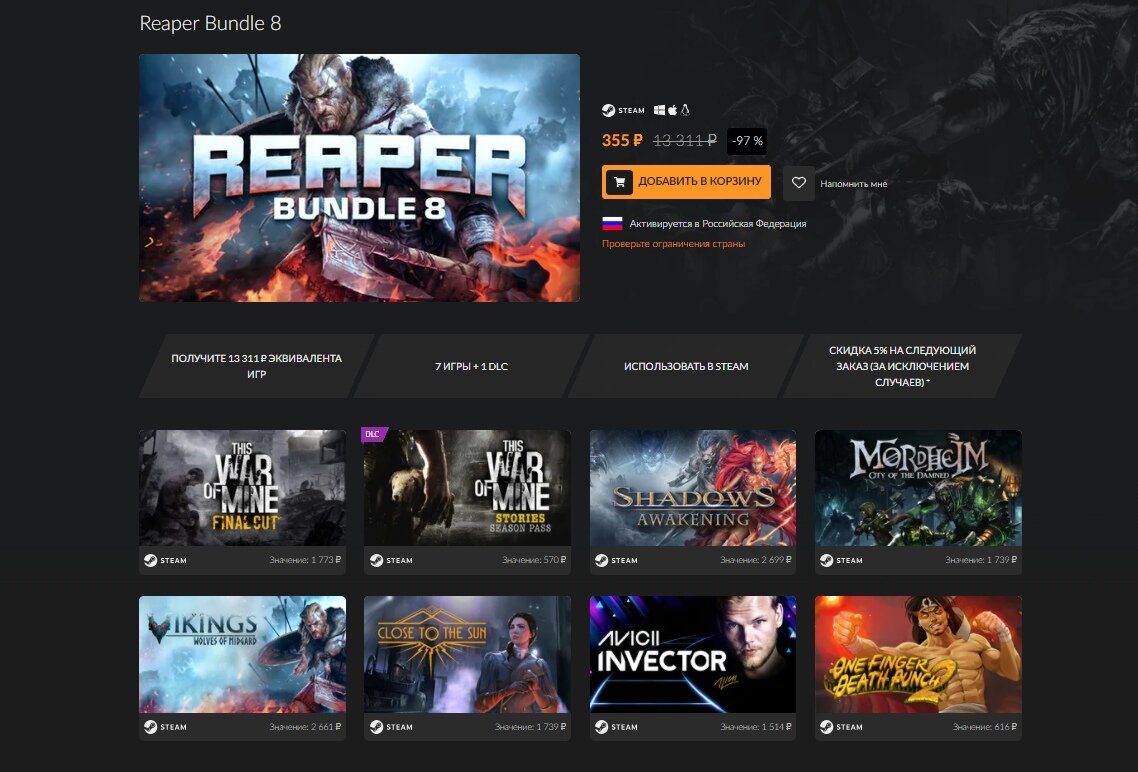 Приятен будет набор тем, кто еще не успел купить часть этих игр. В набор вошли: -This War of Mine -Shadows: Awakening -Mordheim: City of the Damned -Vikings - Wolves of Midgard -Close to the Sun -AVICII Invector -One Finger Death Punch 2 Плюс во всех играх есть карточки, что конечно и близко не окупит набор, но будет приятным бонусом.