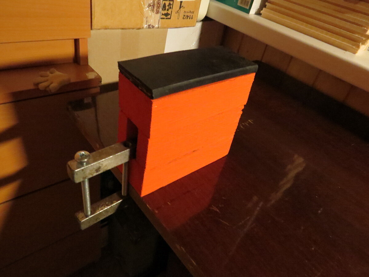 Надоело мне ухаживать за своими горными лыжами на коленке = табуретке :) Захотелось что то поосновательнее. Посмотрел готовые решения в сети, перекрестился и полез искать самоделки. Для беговых лыж самодельных приспособ полно, а для горных весьма негусто. Но идеи появились, а это главное :) Итак нам нужно сделать 3 элемента: центральные тиски и 2 боковые бобышки, ну я их так называю :) Начинаем с простого - боковые бобышки. Просто склеиваем 3 куска бруска 50х60. В центральном бруске перед склейкой делаем пропил для крепления струбцины. И конечно красим оранжевым ))) Чтобы не потерялись ))) Ага, в траве ))) Сверху наклеиваем резину, в моём случае армированную, ну уж какая была :) Крепим струбциной. Кладем лыжу - сцепление хорошее. В принципе просто на двух таких бобышках уже будет удобно парафинить. Но мне этого показалось мало :) А если канты поточить, а если со скользяком поработать мелкий ремонт какой. Делаем центральную, "тисковую" часть. Самое сложное было найти лёгкие тиски с разв