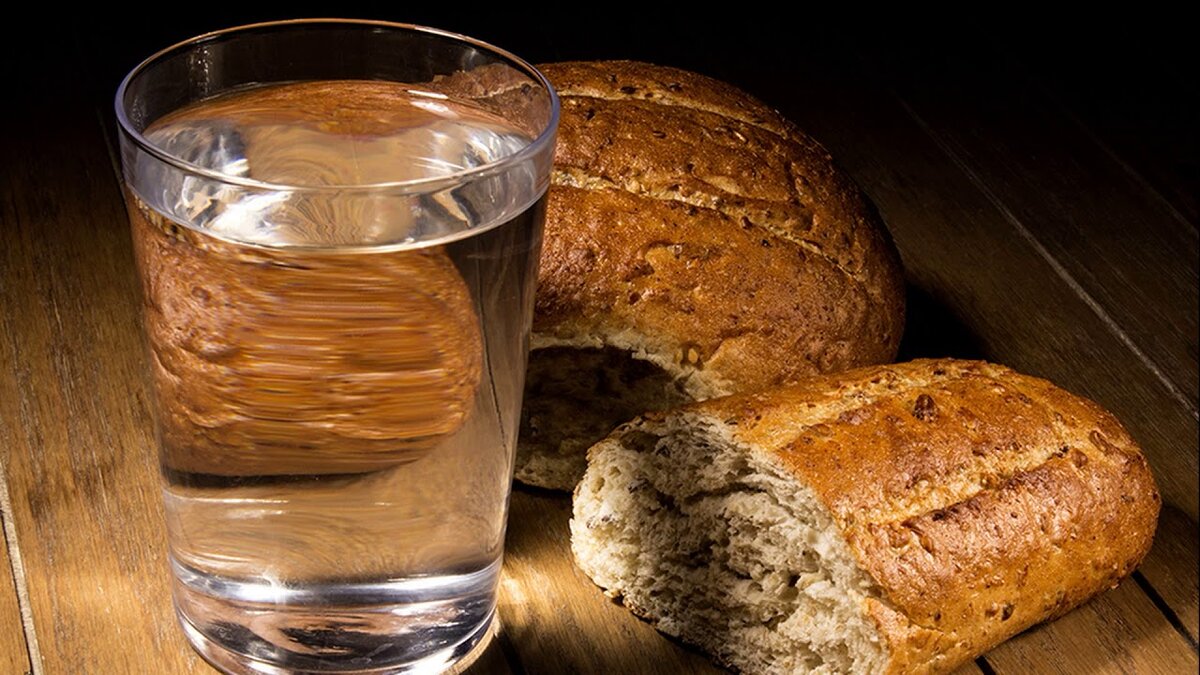 Берём репчатый лук, соль, чёрный хлеб и холодную воду. Лук чистим и нарезаем так, как удобно. Соль насыпаем в блюдце или в крышку от банки, в которой хранится соль. Черный хлеб нарезаем кусочками, а холодную воду наливаем в стакан.