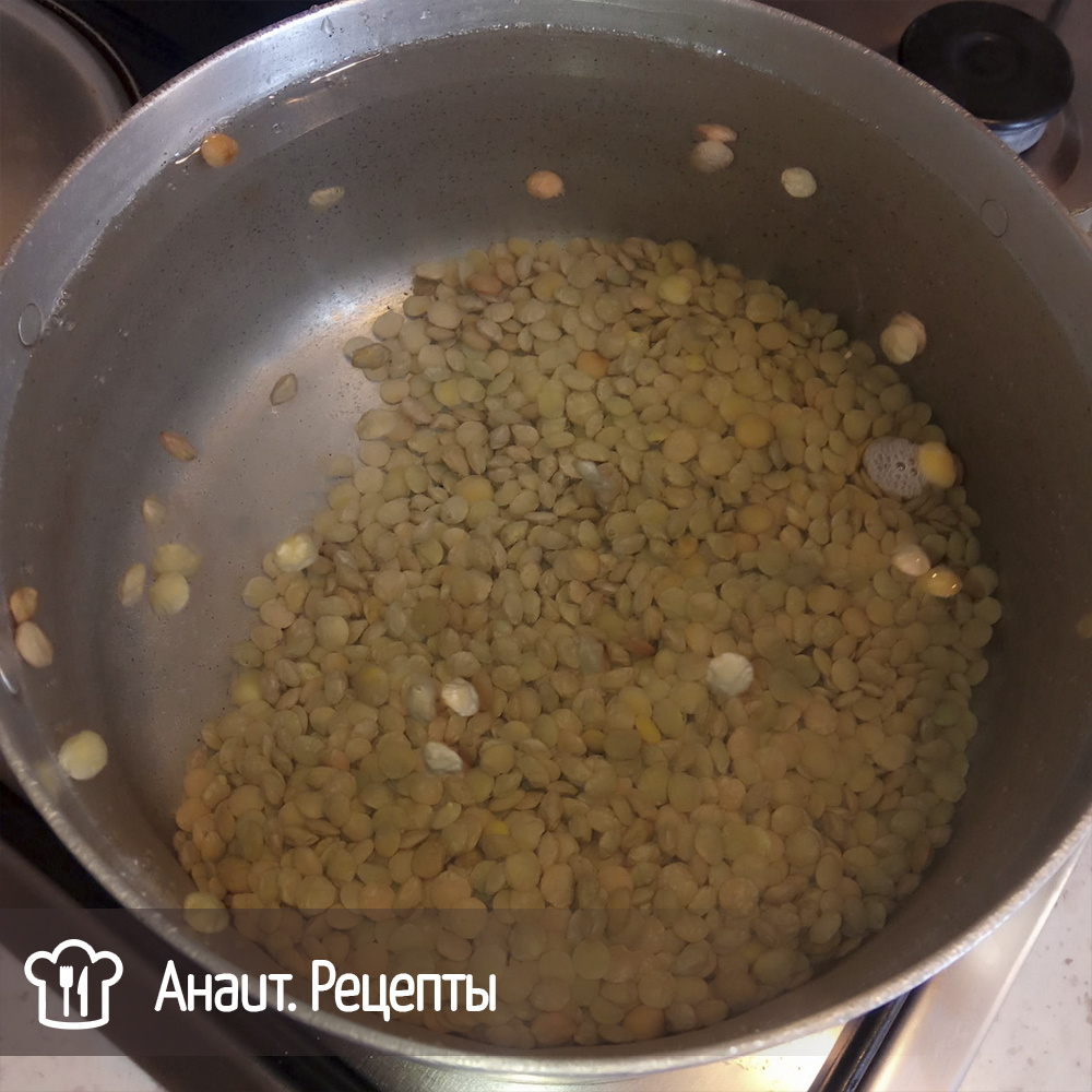 Чечевицу промываем, заливаем большим количеством воды и ставим на огонь. Варим практически до готовности.