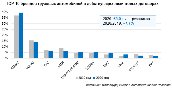 Среди грузовиков, оформленных в лизинг в 2020 году, наибольшим спросом у лизингополучателей пользовалась техника KAMAZ (39,5%). На втором месте