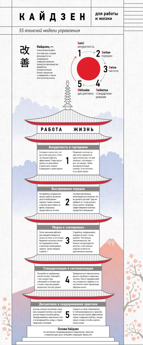 Кайдзен — японская философия, которая фокусируется на непрерывном совершенствовании жизненных процессов. Основа метода состоит из пяти ключевых элементов, или пяти S: