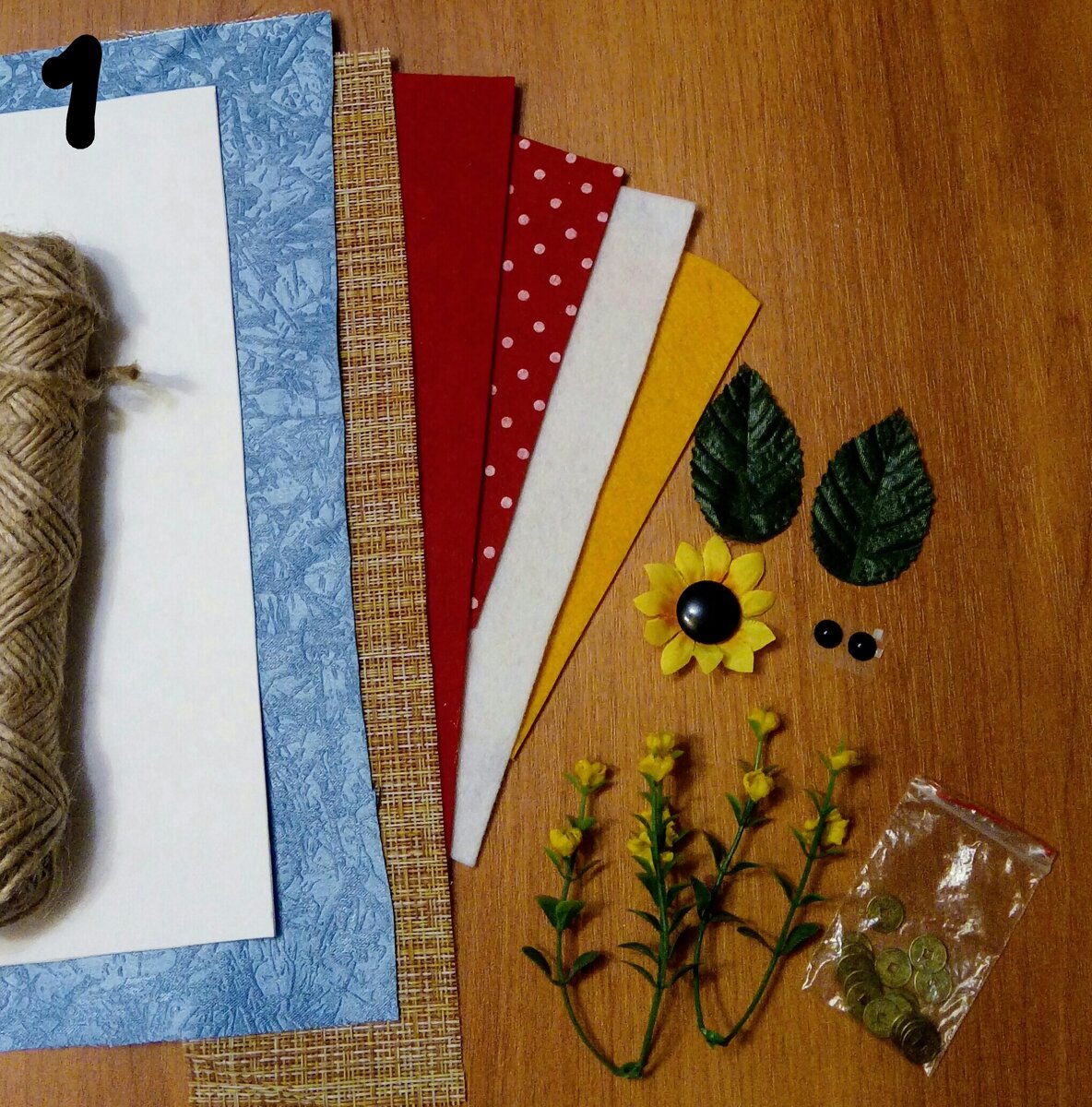 1. Для работы нам понадобятся: картон, голубая бумага или ткань для обряжки картонной основы, для забора серый картон (у меня искусственная рогожка -салфетка), фетр: красный, красный в горошек, белый, желтый, зеленый (если у вас нет искусственных листиков), искусственные веточки и цветочки, две черные полубусины, веревка бечевка, металлические кружочки, клеевой пистолет.
