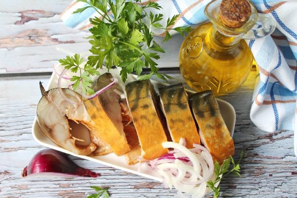 Скумбрия — 1 Штука; Вода — 1 Литр; Сахар — 2 Ст. ложки; Соль — 3 Ст. ложки; Чай черный — 2 Ст. ложки; Шелуха луковая — 1 Пучок; Лавровый лист — 1 Штука; Перец черный — 5 Штук (горошком);