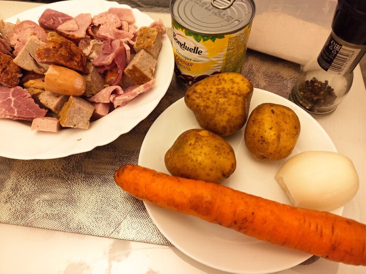 Занимаемся оставшимися ингредиентами: колбасы и лук нарезаем, морковь - натираем.